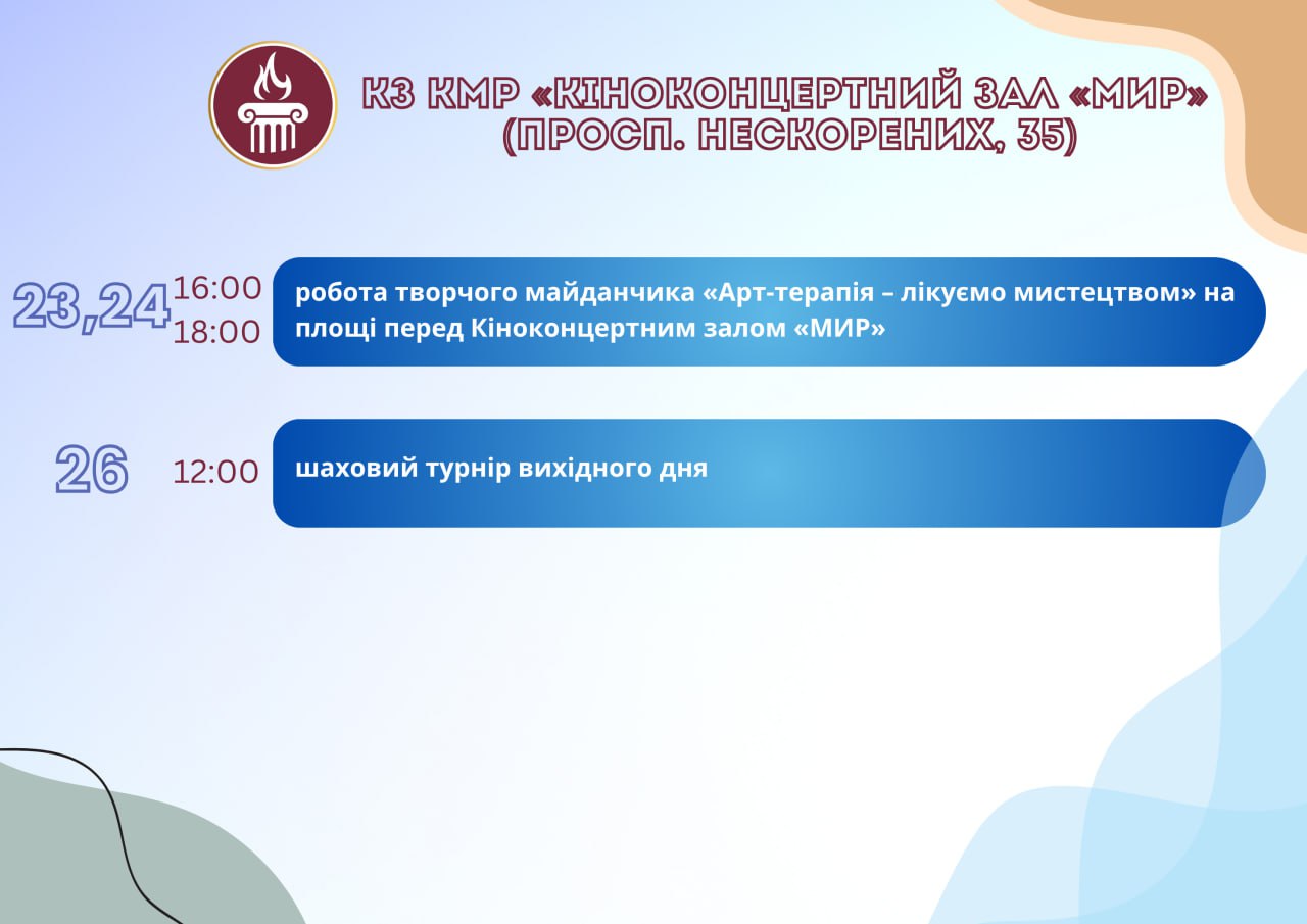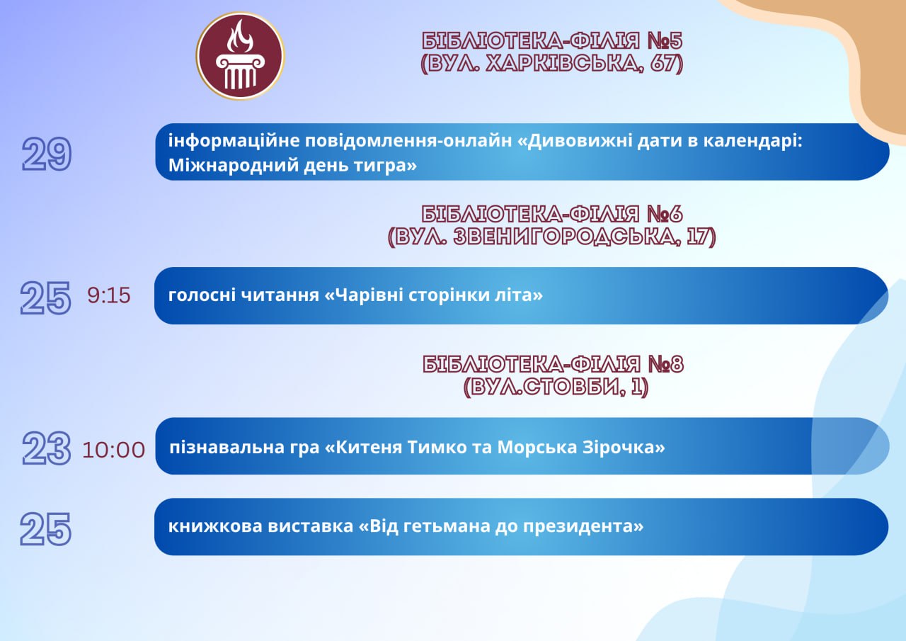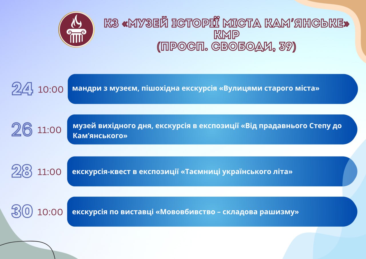 Головна Афіша Програма заходів у закладах культури міста Кам’янське з 23 по 30 липня 30 Липня, 2025 23:00 Вікові обмеження 0+
