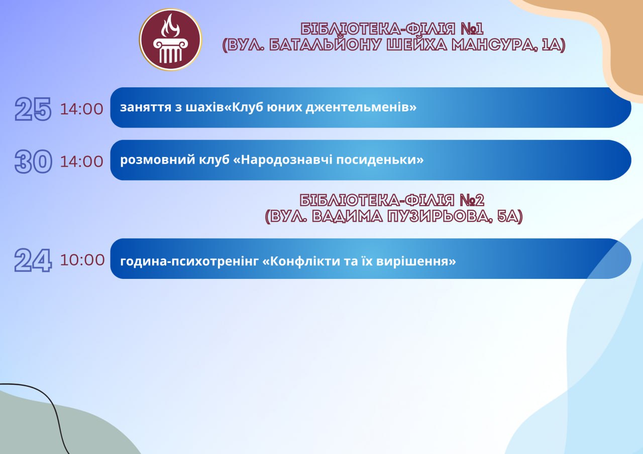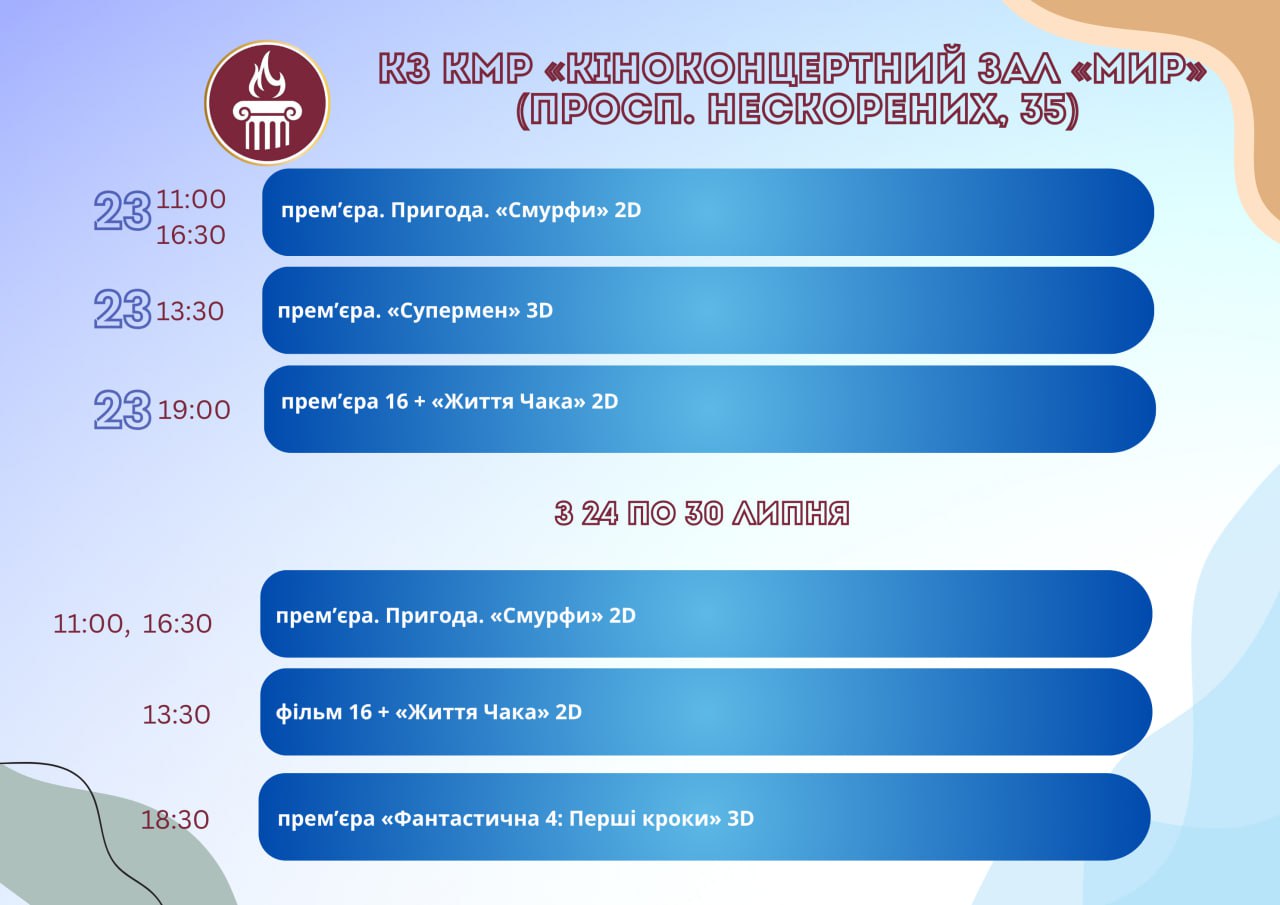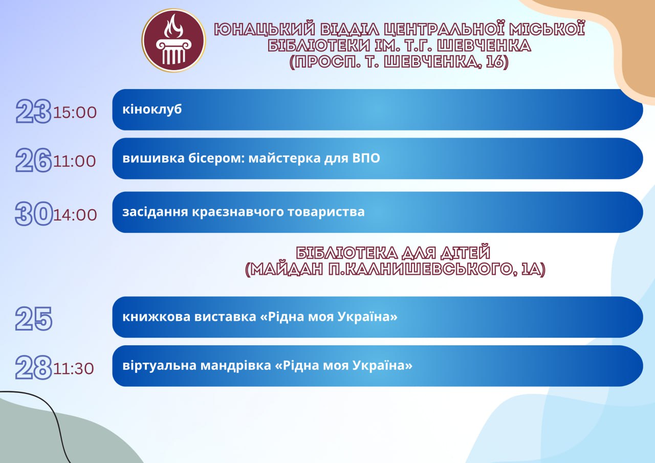 Головна Афіша Програма заходів у закладах культури міста Кам’янське з 23 по 30 липня 30 Липня, 2025 23:00 Вікові обмеження 0+