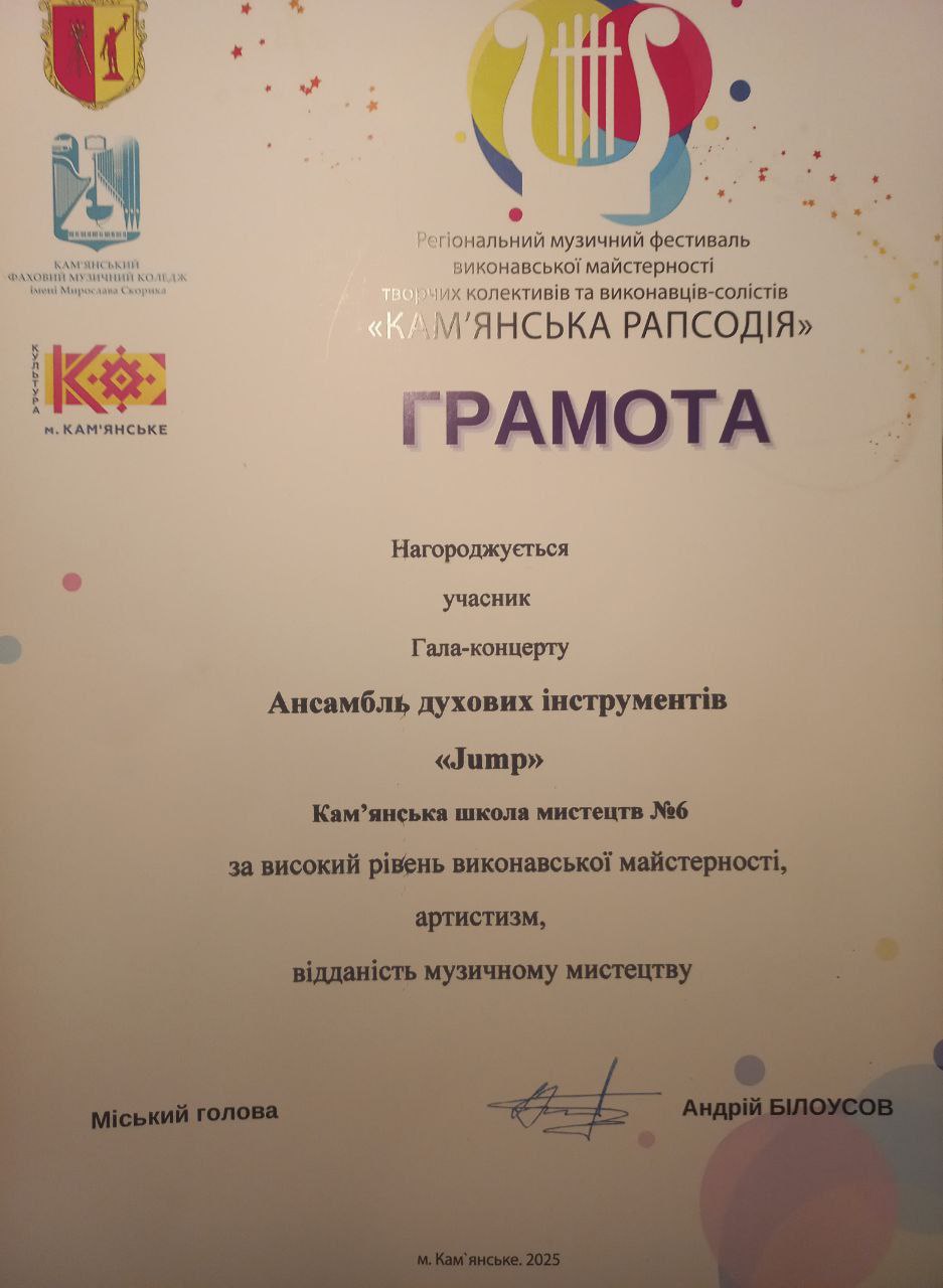 17.04.2025 Кам'янське, Музика, Новини16 квітня 2025 року в Кам’янському фаховому музичному коледжі імені Мирослава Скорика відбувся Гала-концерт ІІІ Регіонального музичного фестивалю “Кам’янська рапсодія”. На сцені — найкращі виступи учнів мистецьких шкіл міста, яскраві емоції, творчість і музика, що об’єднує.