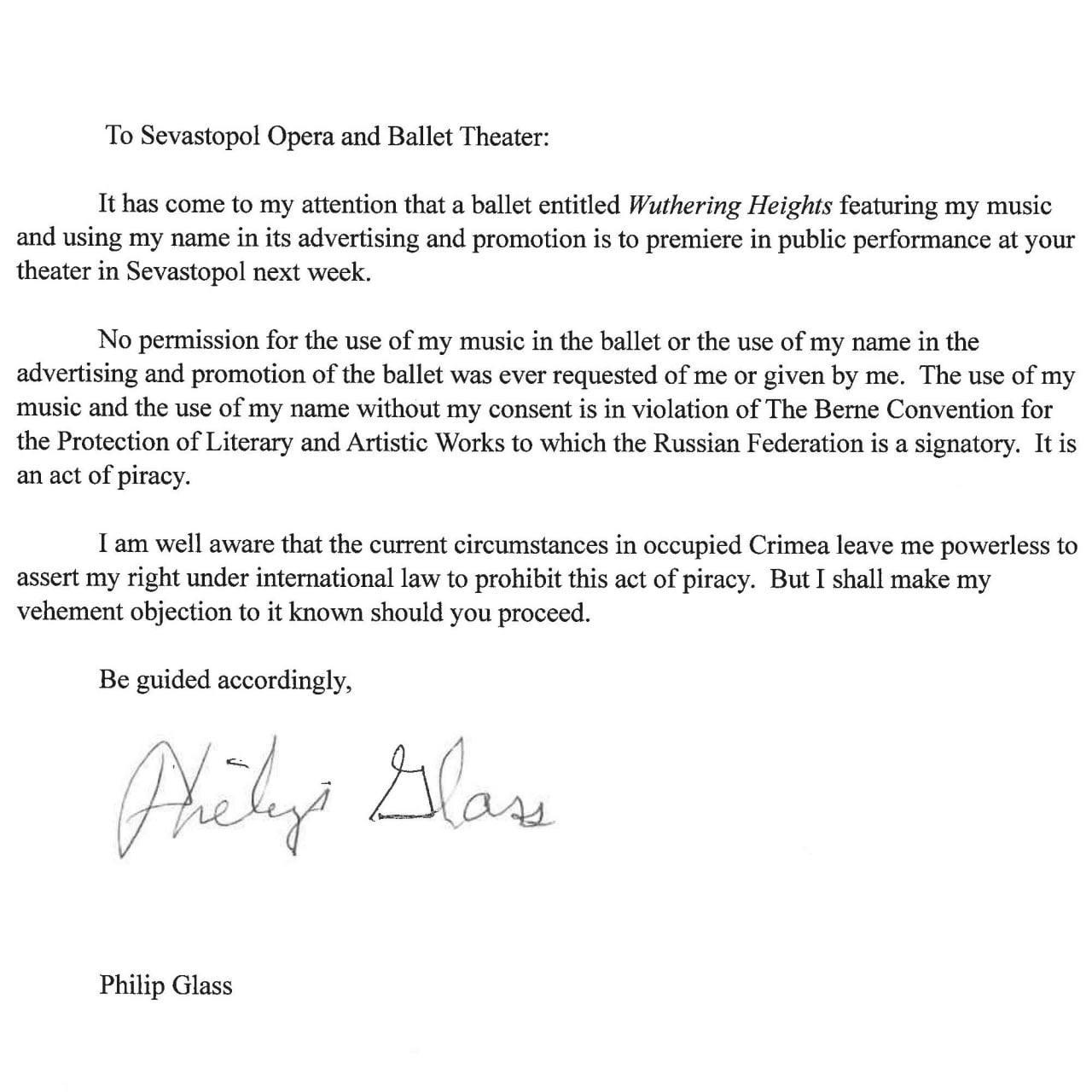 Никакого разрешения на использование моей музыки в балете или использование моего имени в рекламе и продвижении у меня никогда не запрашивалось, и я его не давал, — написал Гласс.