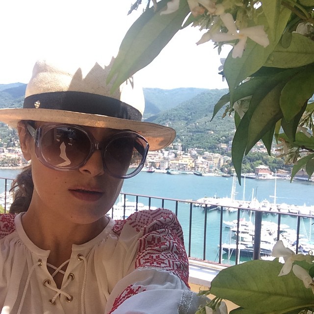 Сальма Хайек также является поклонницей украинского орнамента. В ее коллекции можно найти изумрудную вышиванку, а также белое платье, расшитое красными нитями.
