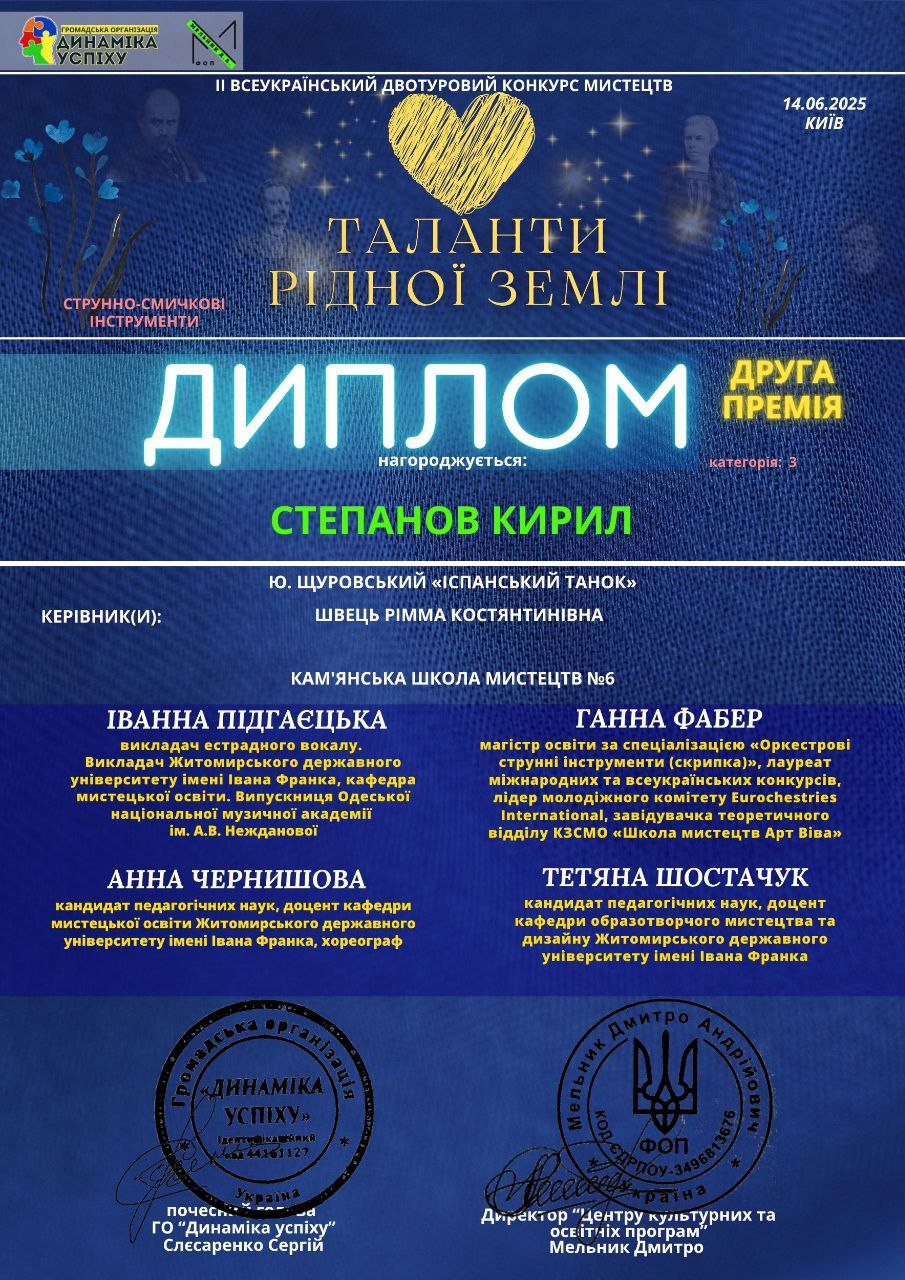 Кирилл Степанов (струнно-сосковый инструмент, преподаватель – Р. Швец) также получил Диплом ІІ степени!