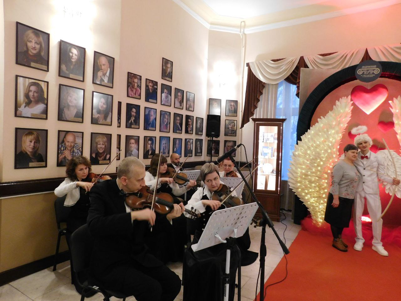 Праздник начался еще в фойе: гостей ждал роскошный подарок — выступление театрального оркестра. Очаровательная живая музыка с первых же аккордов создавала романтическое настроение и особую, приподнятую атмосферу. Дополнял действо милый Купидон, который хозяйничал в тематической фотозоне, где все желающие могли сделать яркий снимок на память об этом вечере.
