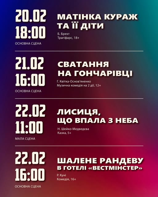 На следующей неделе Каменской театр им. Леси Украинки приглашает погрузиться в мир удивительных историй и живого искусства. Для вас, дорогие зрители, мы подготовили репертуар, который впечатлит каждого: