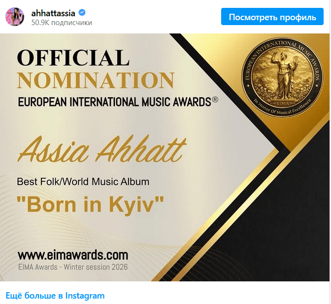 Украинская скрипачка и композитор Ассия Ахат сообщила о весомом достижении на международной арене. Ее пластинка «Born in Kyiv», созданная в коллаборации с иностранными музыкантами, попала в список номинантов авторитетной европейской музыкальной награды.